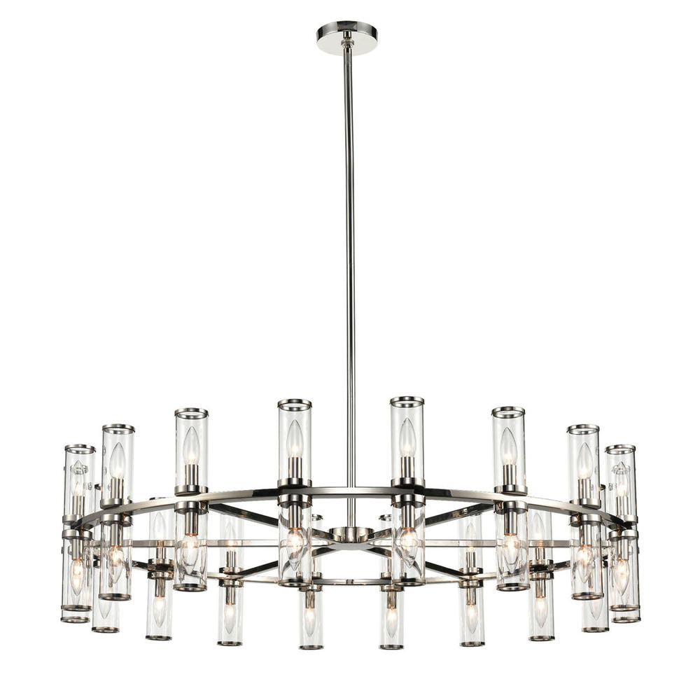 Evoking the elegance of antique candle-holders, Revolve has clear glass tubes accented with metal rings, gathered around a striking chandelier body. Available in our Polished Nickel, Urban Bronze and Natural Brass finishes, also available as a series of coordinating vanity and wall sconces.