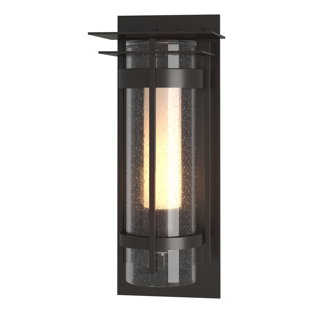 Our Torch Sconces with Top Plate are offered with a substantial and stunning seeded outer glass combined with a frosted inner glass. In addition to the two hallmark circular metal bands and its perpendicular metal accent, this version offers a square metal accent and top plate. Available in all of our robust Coastal Outdoor Finishes. The Banded Outdoor Sconce with Top Plate is also available in a large version.