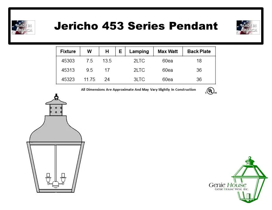 Product Info: This Exterior Hanging Lantern is from the Jericho Collection by Genie House. It is hand crafted and made here in the U.S.A. This series comes in a variety of sizes, finishes and glass options. This is a quick ship item and will typically ship in 3 weeks.