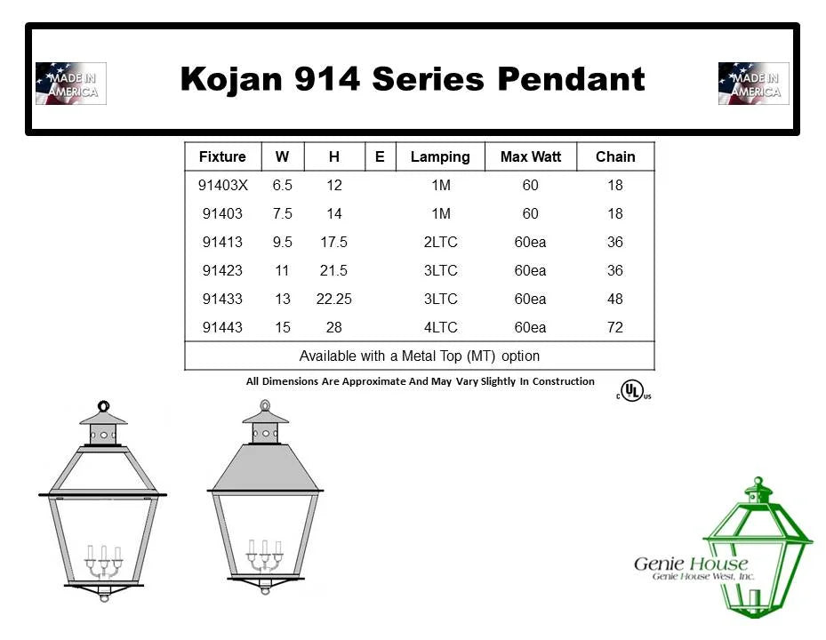 Product Info: This Exterior Hanging Lantern is from the Kojan Collection by Genie House. It is hand crafted and made here in the U.S.A.This company typically ships in 6-8 weeks.This series comes in a variety of sizes, finishes and glass options. This lantern also has an option to have a metal or glass top.