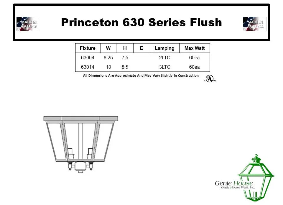 Product Info: This Exterior Ceiling Flush Mount is from the Princess Collection by Genie House. It is hand crafted and made here in the U.S.A.This is a quick ship item, and typically takes 3 weeks to ship. This series comes in a variety of sizes, finishes and glass options.