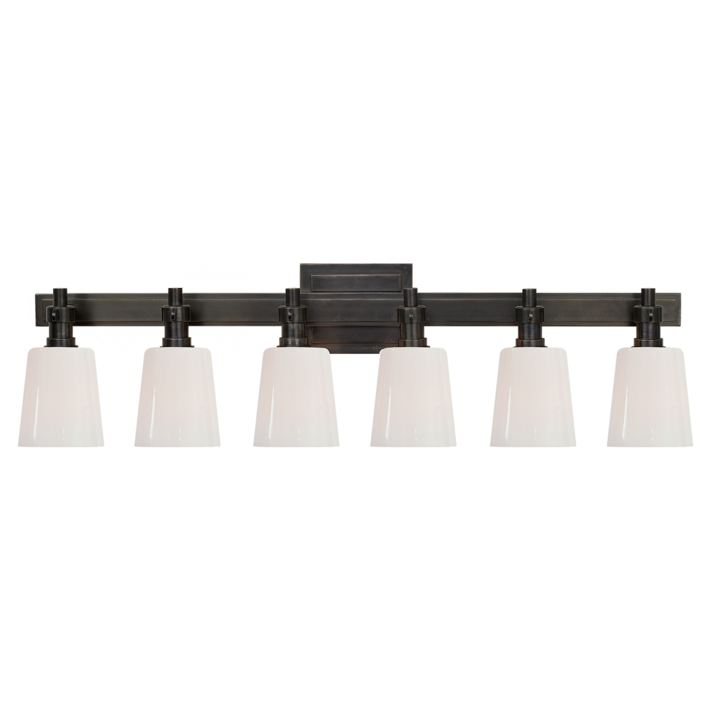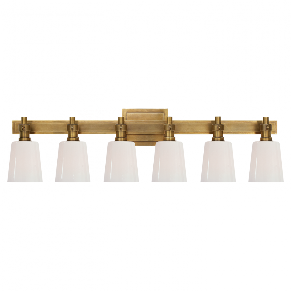 Bryant Six-Light Linear Bath Sconce in Antique Nickel with White Glass