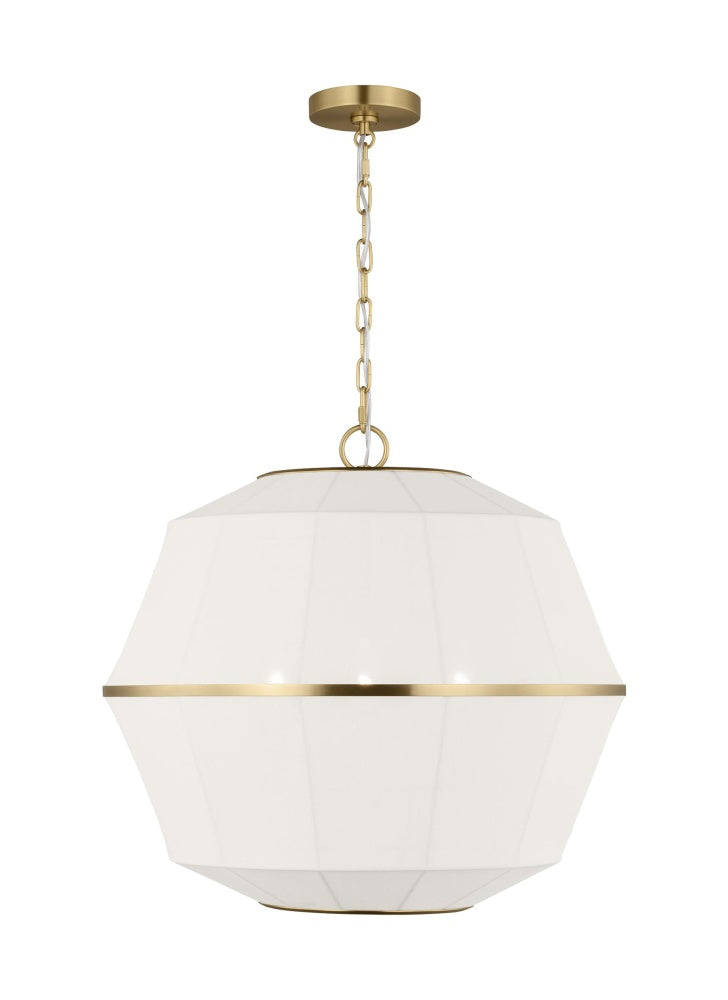 Showcasing multifaceted geometry, the Hikari series by Ellen DeGeneres is inspired by her personal collection of sculptural lighting. Grounded by the contrast of hard and soft materials, the aged iron and white linen fixture radiates soft, diffused light. The Hikari pendant can be used in a dining room, living room, bedroom or entryway.