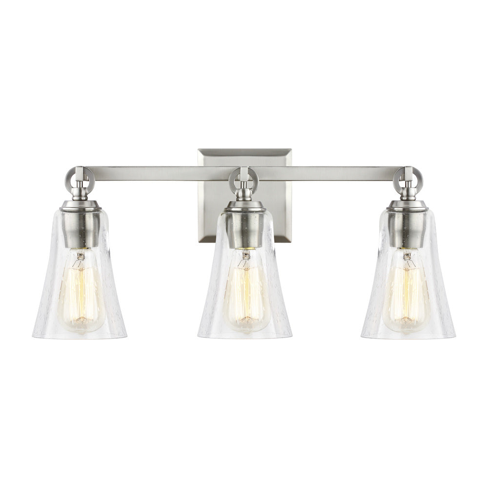 The Monterro three light vanity fixture in satin nickel offers shadow-free lighting in your powder room, spa, or master bath room. Monterro features beautiful tapered glass shades and exquisite cast details, including a cast backplate, cast ring, and hook hardware that elegantly supports the shades. The Chrome version is available with two glass options; either White Opal Etched glass or Clear Seeded glass, while the Burnished Brass, Satin Nickel finish is available in Clear Seeded glass only.